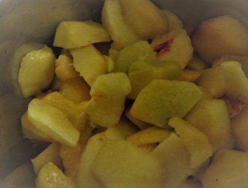 Die Pfirsiche schälen und in kleine Stücke schneiden. Diese in einen Topf geben, den Chantré dazgießen und auf niedriger Stufe kochen lassen, bis die Fruchtstücke weich sind.