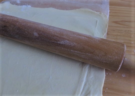 Den Blätterteig ausrollen und in zwei gleiche Teile teilen. Falls man keine Teigform hat, beide Teile in gleichgroße Quadrate teilen, einen Teelöffel von der Creme daraufgeben und zu einem Dreieck formen.