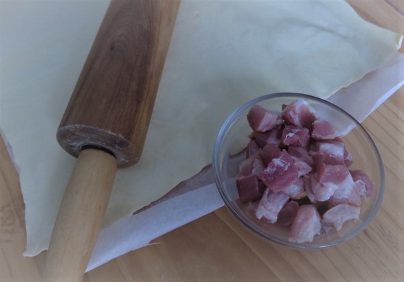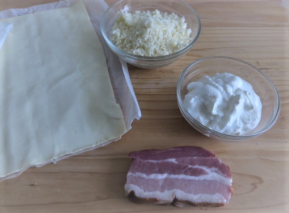 200 g Creme fraiche, 50 g du lard fume, 50 - 100 g du fromage rape, 1 paquet de pate feuilletee